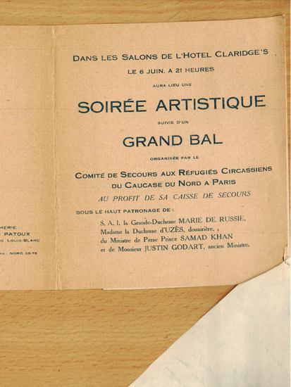 На этот раз Маирбек предоставил для публикации еще один интересный документ из своего архива – объявление о вечере в отеле Кларидж, организованном Comite de Secours des Refugies Circassiens du Caucase du Nord a Paris, т.е. Комитетом помощи черкесским беженцам с Кавказа.