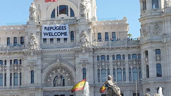 Я уже писала, что этим летом удалось побывать в Испании. Так вот, чуть ли не первым зданием, которое мы увидели, приехав в Мадрид, стало здание Мэрии на площади Себелес (площади Кибелы, богини плодородия). Здание возвели в начале ХХ века. Когда-то здесь находился Главпочтампт, а теперь оно отдано мэрии. На нем красовался огромный плакат – “REFUGEES WELCOME”.