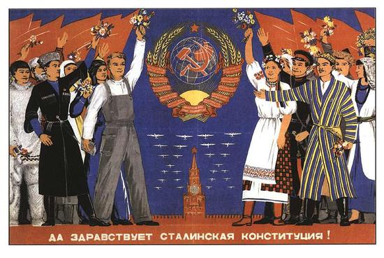 В 1936 году происходит эпохальное событие - была принята Конституция СССР 1936 года, часто называемая «Сталинская конституция» или — «Конституция победившего социализма». Серьезное внимание в новом законе было уделено правам граждан СССР, что и нашло отражение и в плакате, где кавказский горец на равных с представителями всех народов СССР приветствует свою столицу Москву и Кремль как символ советской власти. Романтичный букетик цветов в руках у горца делает его образ немного комичным - и до сих пор в кавказской традиции мужчины не ходят с букетами цветов.