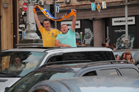 Группу этих болельщиков за пару минут до снимка остановил местный патрульный, проверив и убедившись что они не пьяны и не буянят, отпустил. Они довольно спокойно отреагировали на то, что я их фотографировал, и были не против попозировать.