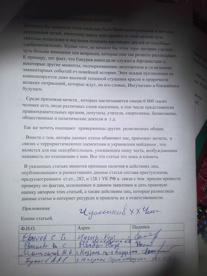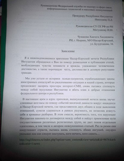 Я и нижеподписавшиеся прихожане Насыр-Кортской мечети Республики Ингушетия обращаемся к Вам по поводу размещения и публикации статей, возбуждающих чувства ненависти и вражды, унижающее человеческое достоинство, а также порочащую  честь, достоинство и деловую репутацию граждан.