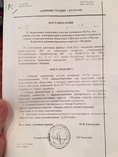 В 2011 году постановлением за №400, городские власти, вняв наконец-то к мольбам и просьбам жителей Насыр-Корта, отвели земли, для выделения нуждающимся в земельном участке для жилищного строительства. Отведенный для сельчан земельный массив располагается на окраине г. Назрань, за Алханчуртским каналом в районе 105 жилого массива, около Государственного унитарного предприятия «Насыр-Кортское». Со слов жителей Насыр-Кортского м/о, немногим позже, они все чаще стали слышать от посторонних людей о приобретении последними земельных участков именно в отведенном им в 2011 году земельном массиве, но при этом, самих сельчан к земельным участкам не допускали.  Спустя 3 года, уже в 2014-м, постановление об отводе земельного массива было отменено, но, со слов сельчан, которые представились Магомед-Баширом, Муссой, Али и Яхьей, есть люди, жители других населенных пунктов, которым приходят квитанции к оплате земельного налога за владение земельными участками в том самом массиве, о существовании которых они даже не знали. В числе несостоявшихся обладателей земельных участков, жители Насыр-Корта, представители множества фамилий, среди которых Евлоевы, Алмазовы, Аушевы, Газгиреевы, Джандиговы, Ханиевы, Бабакиевы, Эсмурзиевы и другие.