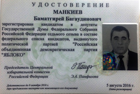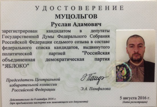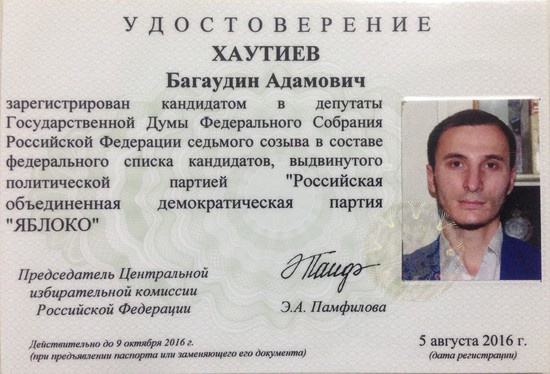 Центральная избирательная комиссия Российской Федерации зарегистрировала в качестве кандидатов в депутаты Государственной думы в составе федерального списка партии «ЯБЛОКО» троих жителей республики: председатель Ингушского «ЯБЛОКА» Руслан Муцольгов, общественный деятель Баматгирей Манкиев и председатель Координационного совета молодежных организаций Республики Ингушетия Багаудин Хаутиев.