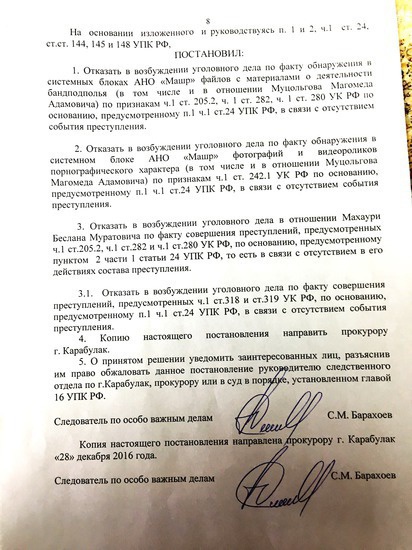 Совсем недавно, эта история получила свое продолжение, точнее сказать приблизилась к логическому концу. После тех событий прошло уже больше года и все это время следственные органы как-то не понятно вели бесперспективные доследственные проверки. Неоднократно выносились постановления об отказе в возбуждении уголовных дел, которые позже отменялись без наличия на то разумных оснований. И вот в конце 2016 года, нашелся в следственных органах человек, который все-таки взял на себя ответственность за принятие законного решения и отказал в возбуждении уголовного дела, как выяснилось, аж по целым 4 статьям Уголовного кодекса Российской Федерации.