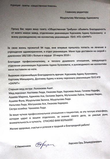 Орц мудрый и очень принципиальный общественный деятель. Он попросил нас опубликовать благодарность нашим врачам, за оказанную ему недавно медицинскую помощь, за уход и оказанное внимание во время лечения. Обычно мы так не поступаем, не публикуем благодарности людям, которые занимают различные должности и хорошо выполняют свою работу, но в данном случае, мы сделали исключение, из-за уважения к Орцу Харсиеву и его многолетней общественной деятельности на благо собственного народа.
