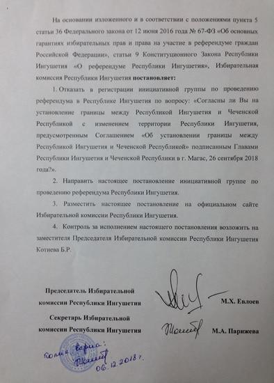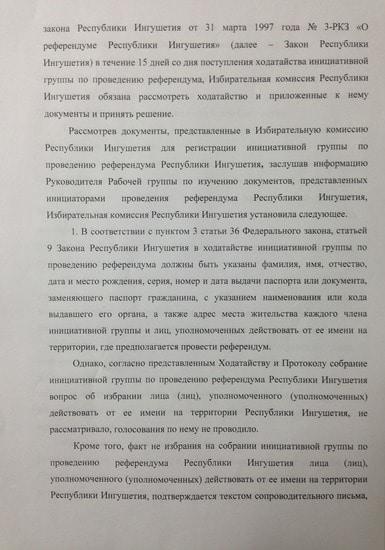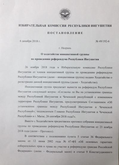 Необходимый пакет документов, был направлен в республиканскую Избирательную комиссию 26 ноября, https://www.kavkaz-uzel.eu/blogs/342/posts/35477. 6 декабря, спустя 10 дней после подачи документов, Избирком Ингушетии провел заседание и отказал в регистрации инициативной группы. Заседание Избиркома было назначено на 11 часов дня, но в последний момент, за полчаса до начала, оно было перенесено на 15 часов.
