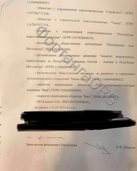 Осенью 2018 года, практически сразу по окончанию двухнедельного многотысячного митинга в Магасе, в сеть попала фотография очень интересного документа. Это был запрос Управления ФСБ по Ингушетии, в один из госорганов, в котором содержалось требование предоставления информации, по различным юридическим лицам и индивидуальным предпринимателям. Спецслужбы собирали информацию о различных общественных и коммерческих организаций. Объединяло их все то, что в числе их учредителей либо руководителей, являлись представители общественности и гражданские активисты. Я уверен, что перечень этих организаций конечно же не исчерпывающий и возможно это был не единственный такой запрос. Тогда об этом было много чего написано, в том числе и вот по этим ссылкам https://www.kavkazr.com/a/29551453.html и https://news.myseldon.com/ru/news/index/197170079?requestId=fbd3a72a-4014-42d7-8aed-11189c7b4b96.