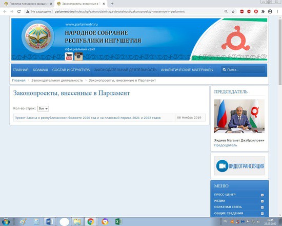 Кстати, направляя заключение он указал и на тот факт, что в нарушении норм действующего законодательства, на сайте Народного собрания Республики Ингушетия, указанный законопроект не был опубликован. Кроме того, последний законопроект, опубликованный в разделе «Законопроекты, внесенные в Парламент» сайта, был опубликован в ноябре 2019 года, что ограничивает доступ населения республики к информации о деятельности Законодательного органа – Народного Собрания Республики Ингушетии.