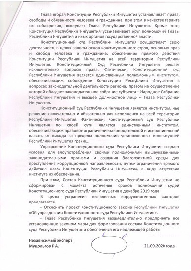 Муцольговым Русланом Адамовичем, аккредитованным в качестве независимого эксперта антикоррупционной экспертизы нормативных правовых актов и проектов нормативных правовых актов распоряжением Минюста России от 21.12.2012 г. №2875-р, в соответствии со статьей 5 Федерального закона от 17 июля 2009 г. № 172-ФЗ «Об антикоррупционной экспертизе нормативных правовых актов и проектов нормативных правовых актов»*, пунктом 4 Правил проведения антикоррупционной экспертизы нормативных правовых актов и проектов нормативных правовых актов, утвержденных постановлением Правительства Российской Федерации от 26 февраля 2010 г. № 96, проведена антикоррупционная экспертиза, проекта Конституционного закона Республики Ингушетия «Об упразднении Конституционного суда Республики Ингушетия», в результате которой установлено следующее.