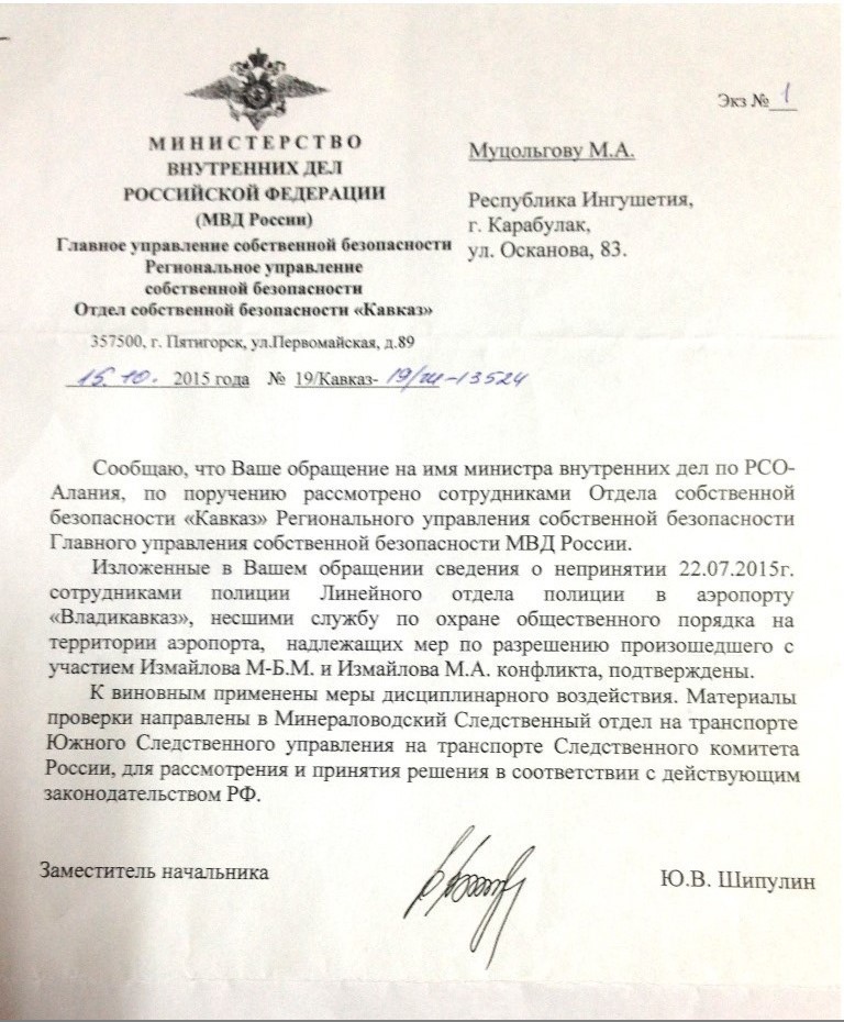 Рассмотрение моего обращения к вам, тогда было поручено тем, на чьи действия я жаловался, тогда же, я из потерпевшего, чуть было не превратился в обвиняемого. Несколько отделов Прокуратуры Республики Ингушетия, Центр противодействия экстремизму МВД по Республике Ингушетия, проводили проверку на протяжении нескольких месяцев. Вызывали меня и опрашивали не менее десяти раз, неоднократно я предоставлял им десятки копий различных документов, но дальше этого, проверяющие изложенные в моем обращении факты, не заходили. Не была дана оценка ни представленным мною неопровержимым доказательствам, а распространенные в сети Интернет аудио доказательства, даже не были изучены.