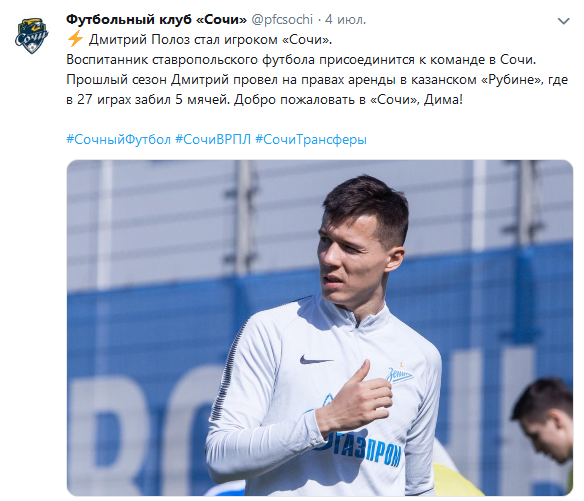 В ФК "Сочи" из Зенита - перешли Полоз, Новосельцев и Цаллагов. Из этих троих, я бы выделил, в первую очердь, Дмитрия Полоза!