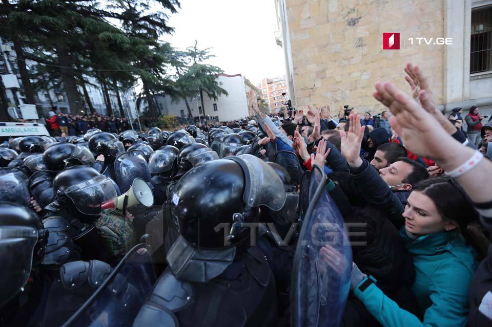 Спецназ оттесняет участников акции у парламента в Тбилиси. Текст. трансляция