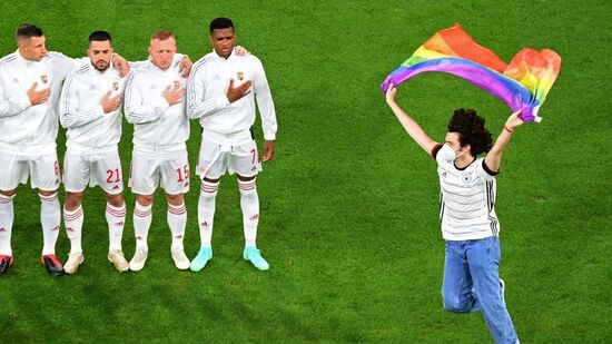Фото: Getty Images     Перед матчем в Мюнхене. Ну, если вы считаете, что героический мальчик выбежал с флагом ГЛБТ случайно, искренне протестуя, это ваше право. Моё -  что это очередная, уже которая по счёту, провокация "эльфов", которые, кажется, слишком зациклились на теме ЛГБТ,  почти превратив её -  в часть новой западной религии.