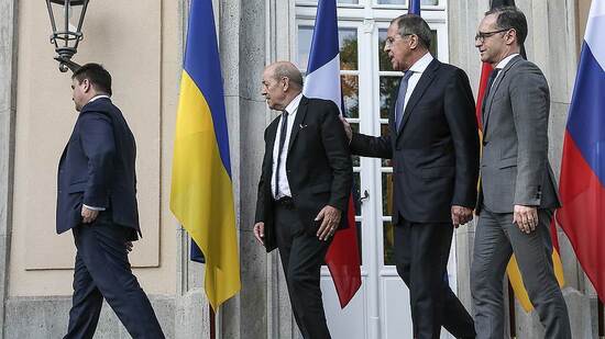 Слева направо: главы МИДов Украины, Франции, России, и Германии Павел Климкин, Жан-Ив ле Дриан, Сергей Лавров и Хайко Маас. Фото: Александр Щербак / ТАСС