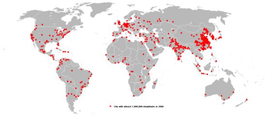 Городские агломерации с более чем 1 млн человек в 2006 году. Лишь 3 % мирового населения проживало в городах в 1800 году и уже 47 % — к концу XX века. Источник: https://ru.wikipedia.org/wiki/%D0%A3%D1%80%D0%B1%D0%B0%D0%BD%D0%B8%D0%B7%D0%B0%D1%86%D0%B8%D1%8F