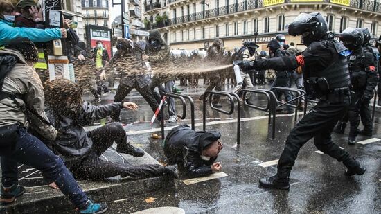 В результате столкновений на первомайских демонстрациях в Париже в больницы попали 12 полицейских, сообщает BFMTV со ссылкой на префектуру полиции Парижа.