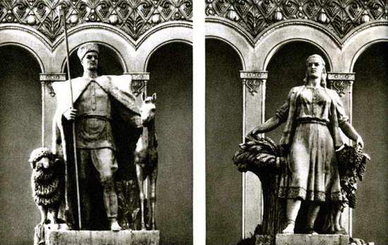 Павильоны национальных республик - это еще храмы продуктов, только экзотических. К Зерну, Мясу и Меду добавляются чай, кофе, айва, виноград, дыни, рахат лукум, апельсины и лимоны. Приобщение к этим продуктам для среднестатистического жителя СССР, привыкшего к постоянному недоеданию в 1930-х, становится подстать ритуальному сакральному действу и все вместе образует единство потрясающего изобилия.