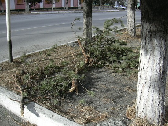 А вот ель у входа на бывшую комбинатовскую канатку (и ещё в нескольких местах вроде бы) прям с корнем вырвало: