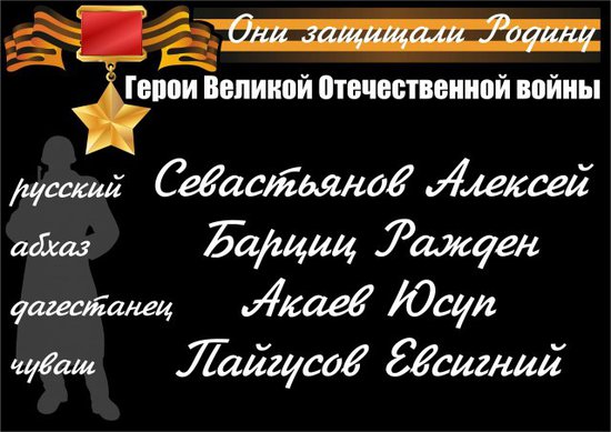 p.s.: прямо в тему. Российский Конгресс народов Кавказа запускает в это воскресенье акцию "они защищали нашу родину". "Несколько тысяч стикеров с именами героев ВОВ разных национальностей на стеклах автомобилей должны напомнить всем, что когда-то, 66 лет назад, не разделяясь ни по каким признакам, русские и якуты, калмыки и чеченцы, карачаевцы и татары и многие-многие другие…одержали победу, одну на всех".Вот некоторые из них.