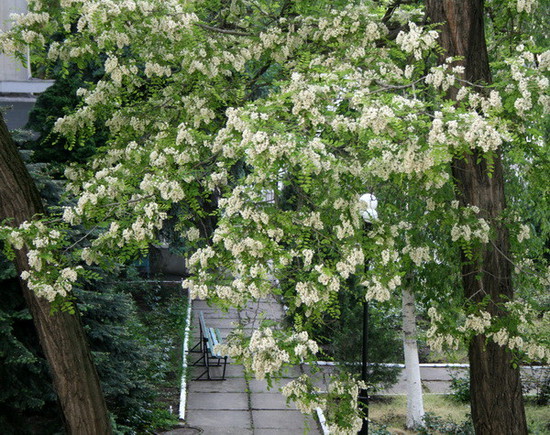Вчера, когда приехал на работу и в первый раз вышел на балкон, первое, что почувствовал - это ощущение откуда-то издалека, аромат из какого-то приятного прошлого. Передо мной, в нескольких метрах от балкона, со двора ректората ниспадали огромные гроздья белой акации (а если быть точнее - робинии псевдоакации) и именно от них был этот аромат на всю округу. Весь день хотел об этом написать, даже сделал вечером фото, но так и не успел вчера.