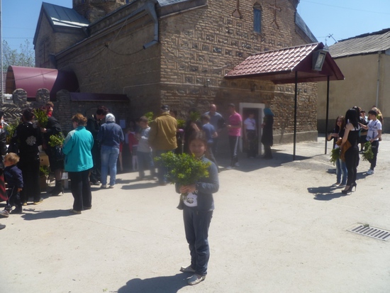 Вчера православные Южной Осетии  праздновали Вербное Воскресенье.  Иисус вошел, вернее въехал на ослике в Иерусалим под ликование толпы! Воистину праздник - парад. Не знаю, кем он был организован церковью ли, или специальным  Комитетом, но прошел он, как и положено  спокойно и радостно. Моя дочь,  играя во вдоре с детьми, услышала колокольный звон помчалась на Церковную  площадь, захватив заранее фотоаппарат. Вот каким  восприняла она празднества Вербного Воскресенья. Это ее фото.