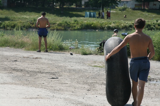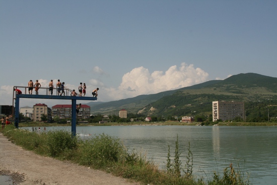 На озеро можно сходить и по поросшей бурьяном наклонной бетонке сбежать в воду,  распугивая лягушек.    На этой же раскаленной бетонке посидеть обсохнуть. Больше то, присесть, а тем более прилечь, особо не на чем. Хотя при обилии техники можно было, и сообразить  искусственные пляж. Песка привести, навесы поставить. Устали уже об этом говорить цхинвальцы.  Но по моему, мы этого никогда не сделаем. Мы же я ярые противники вообще всего удобного, комфортного, красивого, гармоничного. Была бы вода, камера от КАМАЗа и бывший саперный понтон!  А, да еще есть вышка для прыжков!