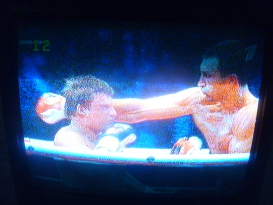 00. 36 - Кличко бьет Поветкина. Третий раунд. Уже есть один нокдаун. Я искренне готовился болеть за российского боксера, русского витязя, Поветкина. Верил, надеялся, что он побьет, надоевшего уже всем, примитивно-прагматичного Кличко. Первый раз в жизни, поставил на него в тотализаторе. Так, что бы поддержать. Но все надежды мои рухнули, когда я увидел, что гимн России, перед боем, поет Кобзон. Априори, не сможет одержать победу, человек, когда «на бой и на подвиги его вдохновил» этот лживый, беспринципный, жуликоватый певун. Вечный конформист, друг террористов и криминальных авторитетов, депутат и ярый государственник в одном, на редкость неприятном, лице.