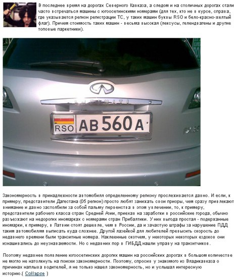 Акцент в статье, во всяком случае, в заглавии, сделан на нарушителях дорожного движения, на территории РФ, с югоосетинскими номерами. Сама по себе, езда с нарушениями, безусловно, важнейшая проблема. Нарушители, это угроза нашей жизни, и о том, что нарушители с югоосетинскими номерами якобы вне закона в России, много и часто говорится. Но, тем не менее, мне кажется, что проблема вполне решаемая. Это вообще не проблема, ничего подобного нет ни в Европе, нет в США, я думаю, и в Китае её нет - но она есть в России. Не может быть такого, чтобы гражданин, чьим бы он ни был, нарушал закон и не отвечал за это. ГИБДД жалуется, что выписывать штраф в нашем случае бесмысленно - потому что адресат проживает вне России. Но ведь есть же куча договоренностей, в том числе и между МВД РЮО и России. Пусть они начнут работать. Можно, например, сделать так, что бы нарушитель, платил штраф сразу же, по факту нарушения, в ближайшем аппарате КИВИ, банке или где это будет удобнее и быстрее. Но дело в том, что в России полицейский стоит на посту, что бы заработать денег себе и для начальства, и ему некогда разбираться с горячими «южанскими» парнями, как и его начальству, некогда придумывать механизм, как их наказывать за нарушения. Вот и гоняют наши ребята, безнаказанными, и в итоге сами же страдают и приносят страдания окружающим. И это не их вина - ими просто не хотят заниматься.