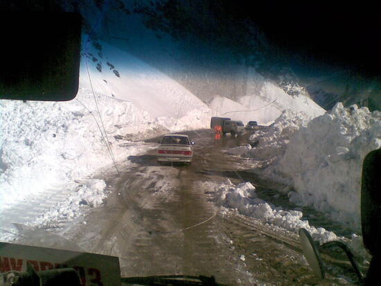 Несколько минут спустя, довольно быстро, практически моментально, появился бульдозер. Но оказывается он ехал разгребать не эту лавину, а ту которая минут 10 назад сошла, но ниже этого места. То есть то место мы уже проехали. Одна лавину мы миновали,  до другой не доехали.