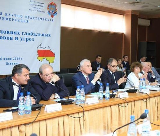 У нас сегодня проводилась  конференция, международная, научно-практическая на тему   «Кавказ в условиях глобальных вызовов и угроз».  Организовал её,  Юго-Осетинский Государственный университет (ЮОГУ) и Российский институт стратегических исследований (РИСИ). Смотрю, кто участвовал, смотрю на фото, так как списка участников не публиковался. Написали только, что участвовали главы Правительства, Парламента, парламентских партий несколько министров ну и преподавательский состав Универститета, и конечно сам Президент.  Какой-то меж собойчик, на мой взгляд получился.