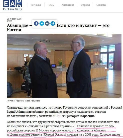 Сначала Карасин, в беседе с Коммерсантом назвал лукавством, намёки Тбилиси, на то, что у них там была надежда, добиться от России, через нормализацию отношений, отмены признания Абхазии и Южной Осетии. И вот, теперь они "дескать, коварно обмануты в своих ожиданиях". Честно говоря, никогда не слышал от кого либо, из российского истэблишмента, даже намеков на это. Может выдавая такое, грузинский истэблишмент, хочет вбить, ну если не кол, то щепку, в отношения РФ-РЮО.