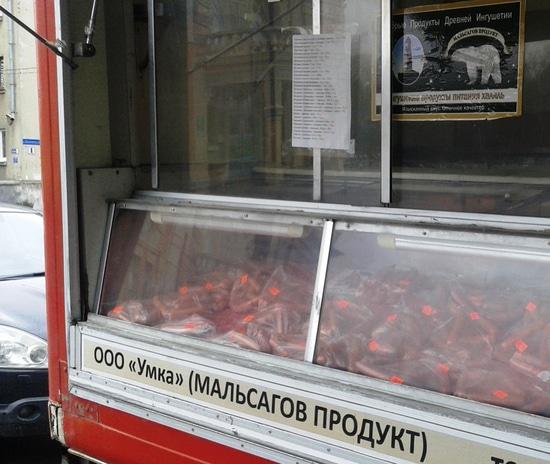 Перейдя реку, снова наткнулся на необычность. У мечети расположилась мясная автолавка с колбасами и прочей снедью - Халяль, производства Иунгушетия. Так и написано "Добрые Продукты Древней Ингушентии".