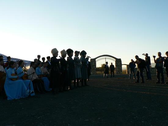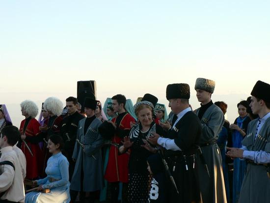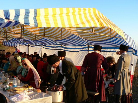 Люди в традиционных осетинских нарядах, песни в многоголосье,  танцы. Радостные лица, общение.