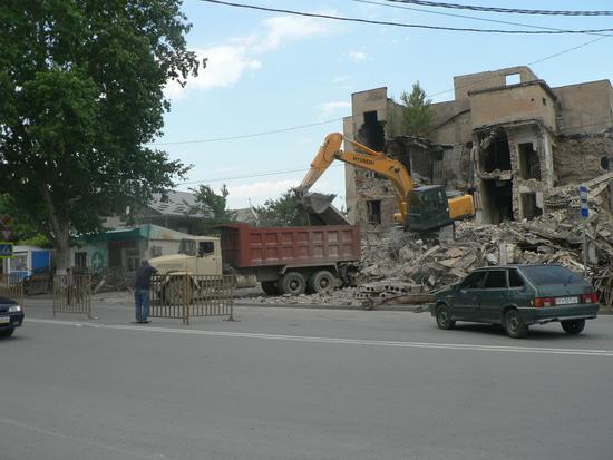 А вот в центре города на Богири, уже какой день  рушат Универмаг, в своё время центральная торговая точка города, он сгорел 09.08.2008. На его месте будет сквер, что конечно  украсит и сделает главную городскую развилку полегче и поуютнее. Правда, я бы кирпичнно-бетонную часть все таки оставил. Под какие ни будь клубы, кафе, общественные заведения, Площади которое занимали торговые залы, вполне достаточно для сквера.  Но строители сами говорят, что легче возвести новое здание, чем восстанавливать старое. Но мы ж не раз убеждались что, то, что  легче для строителей не всегда лучше для горожан.