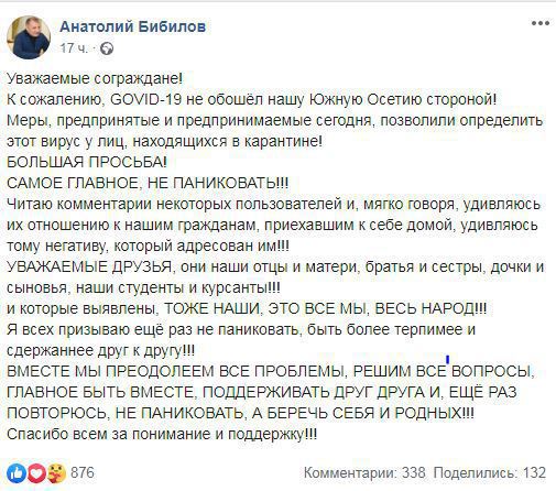 То что в драматичные тяжелые критические моменты лидеры нации в рангах президентов, премьеров генеоальных секретарей и просто генералов или даже полковников  обращаются к своему народу, это нормально и всегда похвально. Обратился к нами наш Президент Анатоий Ильич. Обратился в общем с двумя просьбами   НЕ ПАНИКОВАТЬ!! и  БЕРЕЧЬ СЕБЯ И РОДНЫХ! и призывом быть более терпимее и сдержаннее друг к другу! Орфография и регистр автора  сохраненны