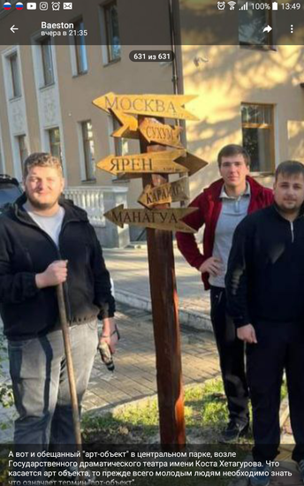 А еще у нас появился артобъект. Артобъект -= мало что само слово созвучно Артеку еще и в установили его пионерском парке. Он представляет собой столб, на котором прибиты указатели в сторону столиц стран признавших нашу Республику. «Этот арт-объект является благодарностью тем странам, которые признали независимость нашей республики. На его фоне могут фотографироваться жители и гости республики», - объяснили члены молодёжного крыла партии «Ныхас», реализовавшие этот проект. Не буду обсуждать арт сторону этого объекта, но вот направления у меня, как у отличника по географии вызывают сомнения. Каракас и Манагуа, насколько мне известно расположены примерно в одном направлении по отношению к Цхинвалу. Но это дело поправимое – главное не ошибиться в ориентации на Москву.