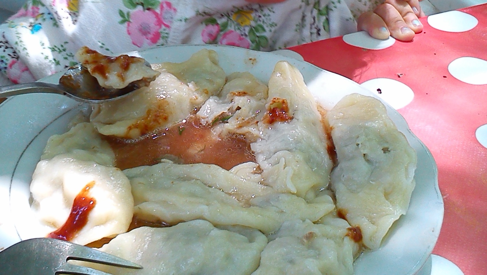 Гырц – те же тесто и мясо. Конвертики из раскатанного теста начиняют мясным фаршем (халяльное). Есть варианты цырц с вяленой крапивой, сыром и наверное еще другими интересными ингредиентами. Конвертики варят в воде с добавлением мясного бульона. К столу подаются те же пиалка с кислятиной и пиалка с чесноком в уксусе.
