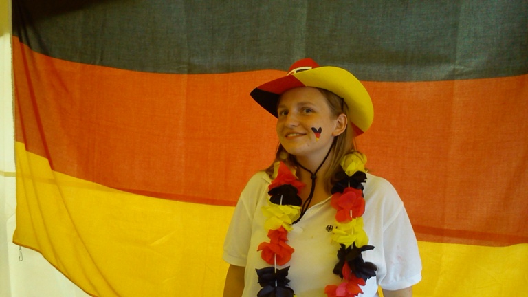 До начала концерта в крепости разбили свои палатки многие страны Евросоюза, раздавая в Евродеревне посетителям туристические буклеты и нанося им на щеки фломастерами флаги своих стран. Так с разноцветными щеками народ на концерт и повалил. Внизу вы видите немку в германской палатке