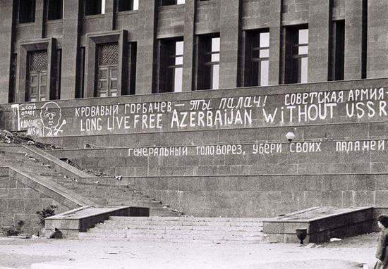 - 19 января 1990 года в Баку и некоторые районы Азербайджана были введены воинские части бывшего Советского Союза. Вторжение в Баку крупного контингента частей Советской армии, внутренних войск и отрядов специального назначения сопровождалось особой жестокостью и невиданными зверствами для г.Баку. Была учинена расправа над мирными демонстрантами, сотни людей были убиты, ранены, пропали без вести. После событий в Тбилиси никто не предполагал такой жестокой акции где-нибудь еще.