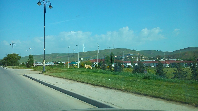 В Гобустане работают ветряные электространции. На нижнем снимке видны три ветряка, вдали, а на следующем фото эти лопасти уже почти крупным планом. Не было ветра и крылья не летали