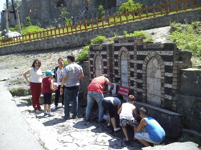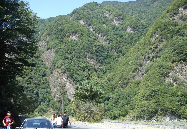 Внизу - последний поворот горы на пути в Илису из Гаха. Здесь у холодного родника обязательно останавливаются туристы, чтобы набрать воды для чая и соревноваться: кто дольше удержит руку в студеной воде?