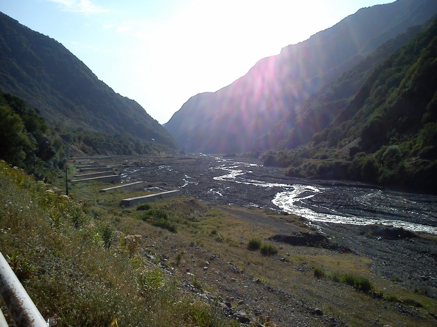 Вид на реку вечером, видны бетонные заграждения против селевых потоков, спасающие берега от размыва