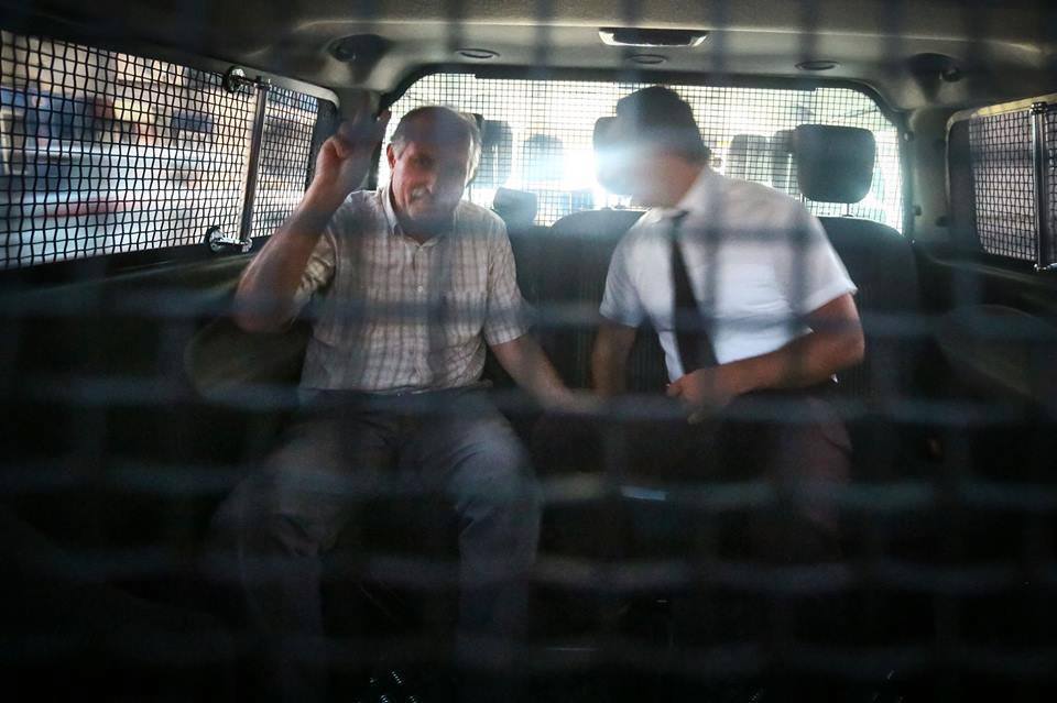 На современном снимке, снятом в прошлом месяце директор агентства "Туран" едет в полицейском фургоне в управление полиции, откуда потом его перевезут в следственный изолятор после суда вынесшего ему три месяца на период следствия. Обвинен в налоговом преступлении. Оба наказаны царями за политическое несогласие с режимами.