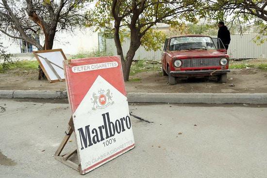 Второй доказательный пример из этого ряда. Журналист Вюгар Мустафаев снял на улицах Баку много фотофактов открытой продажи контрабанных сигарет. Я и не знал - продаются в каких-то самодельных фанерных устройствах, в непригодных автомобилях и даже в легальных газетных киосках.