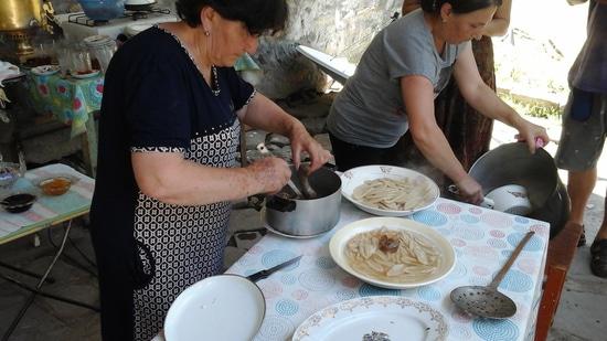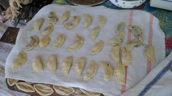На фотографиях гости готовят сюрфюллю — это продавленные сарделечки из теста, облитые мясным отваром, желательно из сушеного мяса, и гырц — маленькие кутабики начиненные мясным фаршем, или сыром, или зеленью. Но гырц не жарится на сковородке как кутаб, а варится в бульоне с обязательным чесноком и кислятиной из сушеных кизилов.