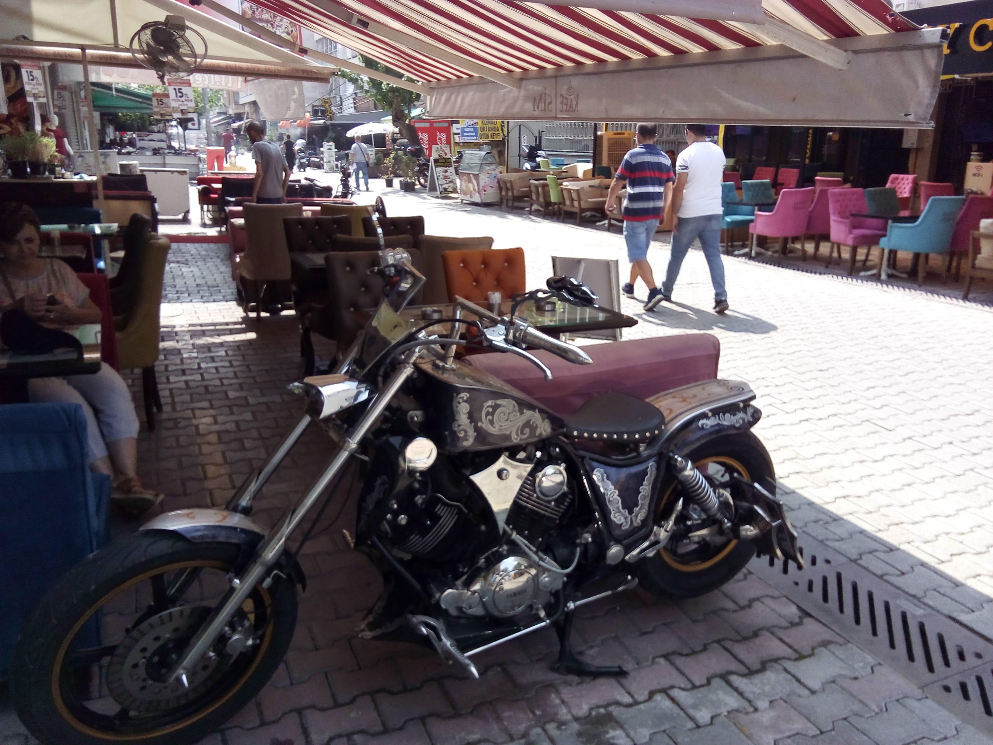 Измира носит название Смирна. В Измире народ модно одевается, мы пили кофе и потом чай в кафе байкеров Я сфотографировал сделанный на заказ мотоцикл. в исторической части Измира разумеется как во всех нормальных городах древняя  крепость и замок а также старые жилые постройки в которых как в других турецких городах сейчас работает крупный рынок. А центр Измира это площадь называемая Саат Куллеси то есть башня с часами . рядом с ней маленькая мечеть .  я туда зашел типично османская архитектура на потолке красивая восточная каллиграфическая вязь.