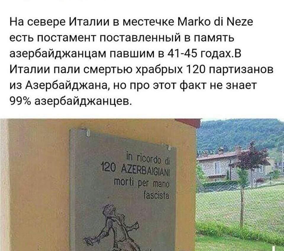 Через машинный переводчик прочитал. В селе, где установлен памятник были зверски замучены 118 азербайджанцев, а в целом по Италии воевало в партизанских лагерях около 2000 азербайджанцев. Перечисляются места их дислокации: в одном месте 600 азербайджанцев, в других 200, 300, 700...