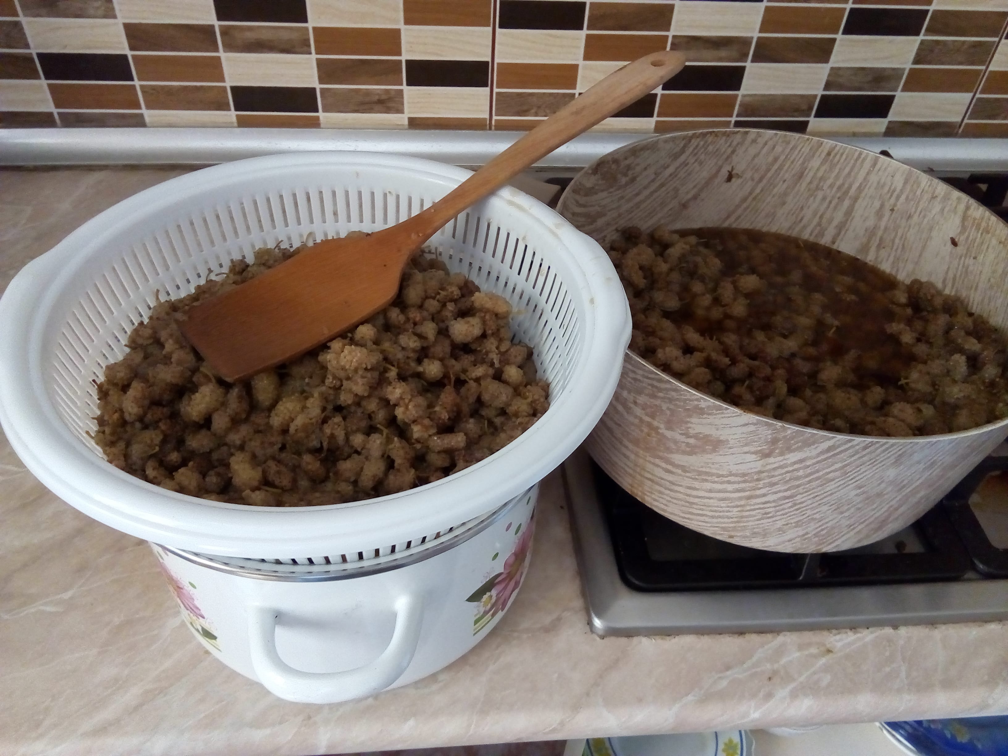 Вчера на даче в Новханы варил свой первый бекмез. Давно решил заняться, три года назад когда купили дачу с гигантским тутовым деревом. Зимой знакомился в интернете с рецептурой, между прочим и лечился чужим бекмезом. При ангине очень эффективное средство.