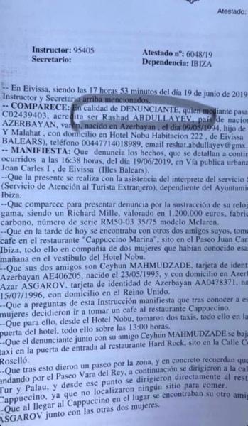 B социальных сетях опубликован протокол испанской полиции о факте кражи На острове Ибица, где у молодого человека из Азербайджана украли часы стоимостью 1.2 млн. евро. Согласно опубликованному документу, имя пострадавшего Рашад Абдуллаев. Это гражданин Азербайджана 1994 года рождения. B протоколе указан его лондонский номер телефона. Сын по имени Рашад есть у президента госнефтяной компании Азербайджана (СОКАР) Ровнага Абдуллаева, - сообщает агентство Turan. фото из Туран