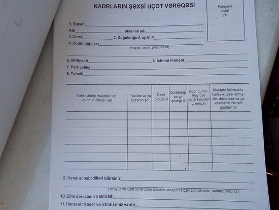 Мое расследование выявило, что граждане покупают эти бланки в обычных газетных киосках, заполняют и сдают в кадровые отделы многих учреждений - не только в Академию Наук. Там принимают и не удивляются вопросам, хотя в инструкции к кадровой службе, как мне сказал руководитель отдела кадров НАНА, требования о перечисленных вопросах нет. Тогда почему такие бланки, заполненные гражданами, принимаются кадровиками? Почему президент НАНА не займется таким советским анахронизмом, не потребует использования вопросника исключительно с вопросами, перечисленными в современной инструкции?